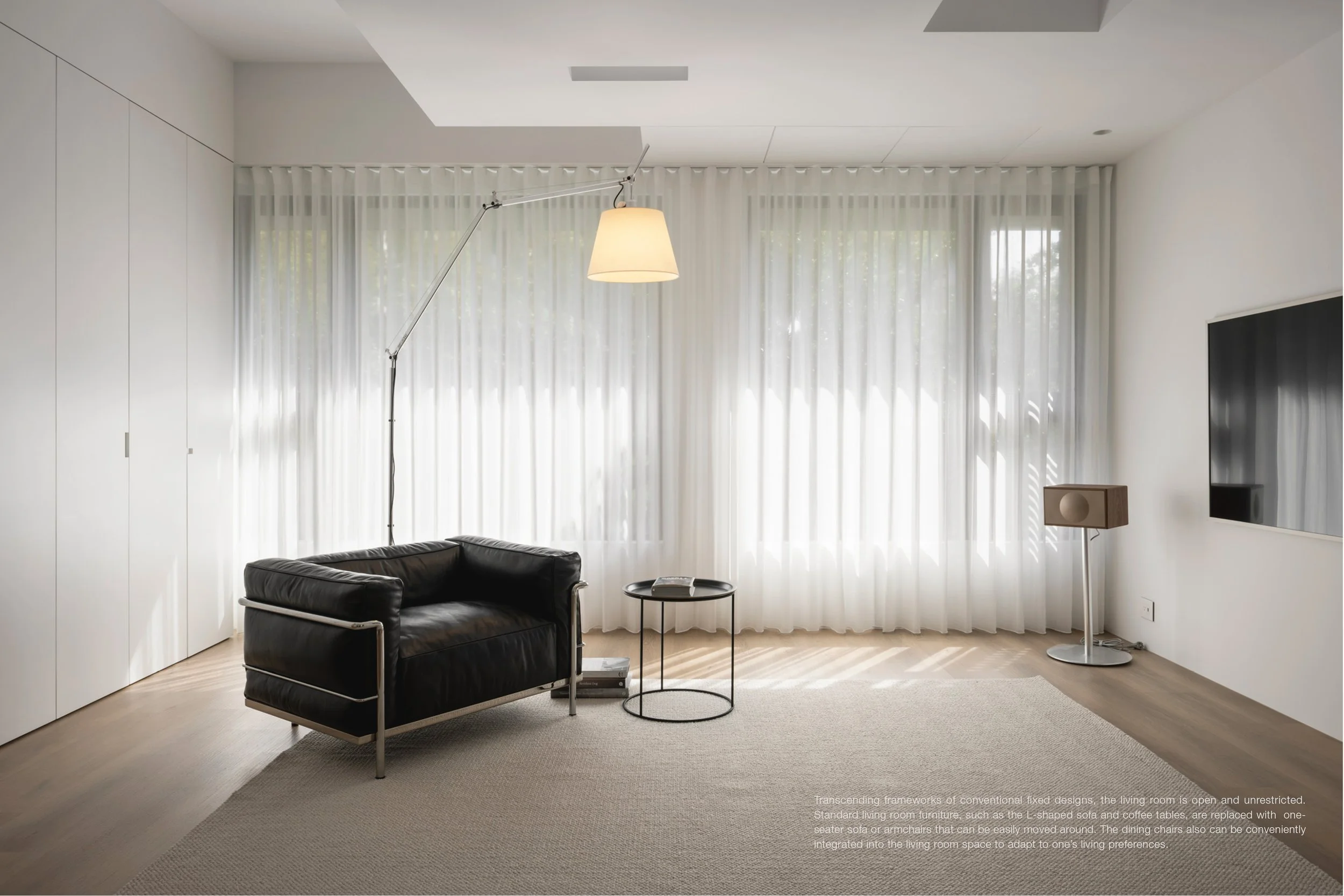 客廳不是一個固定型式的框架,是一個開放、不受拘束的空間形式。不再看見 L型沙發、制式的茶几,取而代之的是方便隨意移動的單人座椅,一旁的餐椅也能靈活運用融入客廳,創造更有彈性的使用型態,回應不同的生活情境。